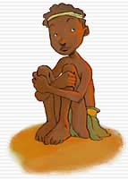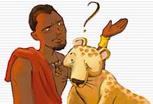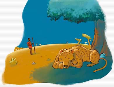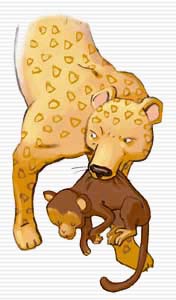 Toute la nuit, le jaguar réfléchit au moyen de forcer le petit d'homme à retrouver le goût de manger. À force de penser et de penser encore, il finit par avoir une idée. Aux aurores, il se tapit sur une branche au-dessus de la rivière et attendit. Il se dit: « C'est la première fois que je travaille pour un homme ! Mon salaire vaudra sûrement son pesant d'or. Un singe passa par là. Il lui sauta dessus et I'assomma d'un bon coup de patte. À midi, il apporta son gibier au Village. Il entra dans la case de Talokoe et s'adressa en ces mots à son fils: « Alima, fils d'homme, hier tu étais faible, tu manges maintenant ce singe, demain tu deviendras aussi agile que lui! » Alima dévora le singe... |